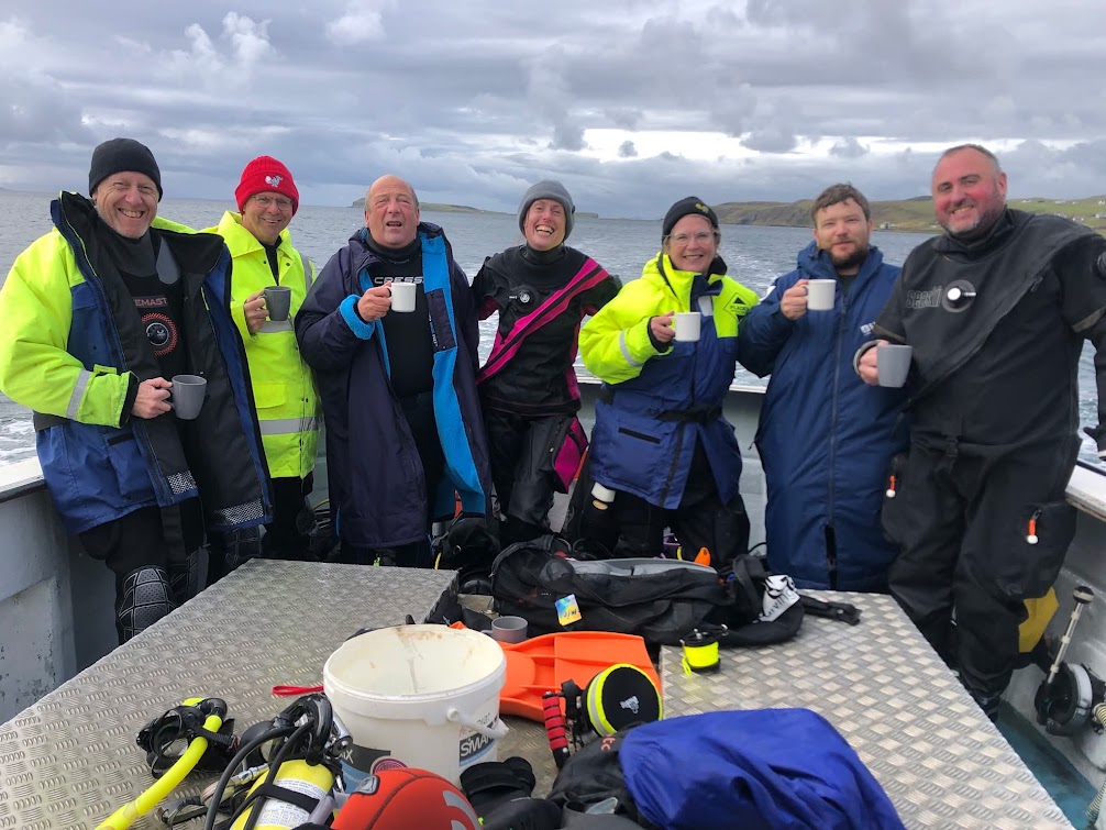 The snorkel sites provided wonderful opportunities to see younger fish and fry sheltering in the seaweed near shore, flashes of a brilliant variety of red little anemone hiding between rocks, barnacles, shore crabs, harbour crabs, and jelly fish. In the shallower water you could also observe the unusual visual disturbances of fresh water meeting the sea water. It was interesting to experience our dives from a different perspective, with Clett Island a particular highlight when the snorkellers were on the same site as the divers. We could excitedly chat about the common sights we had seen, from entirely different vantage points!
