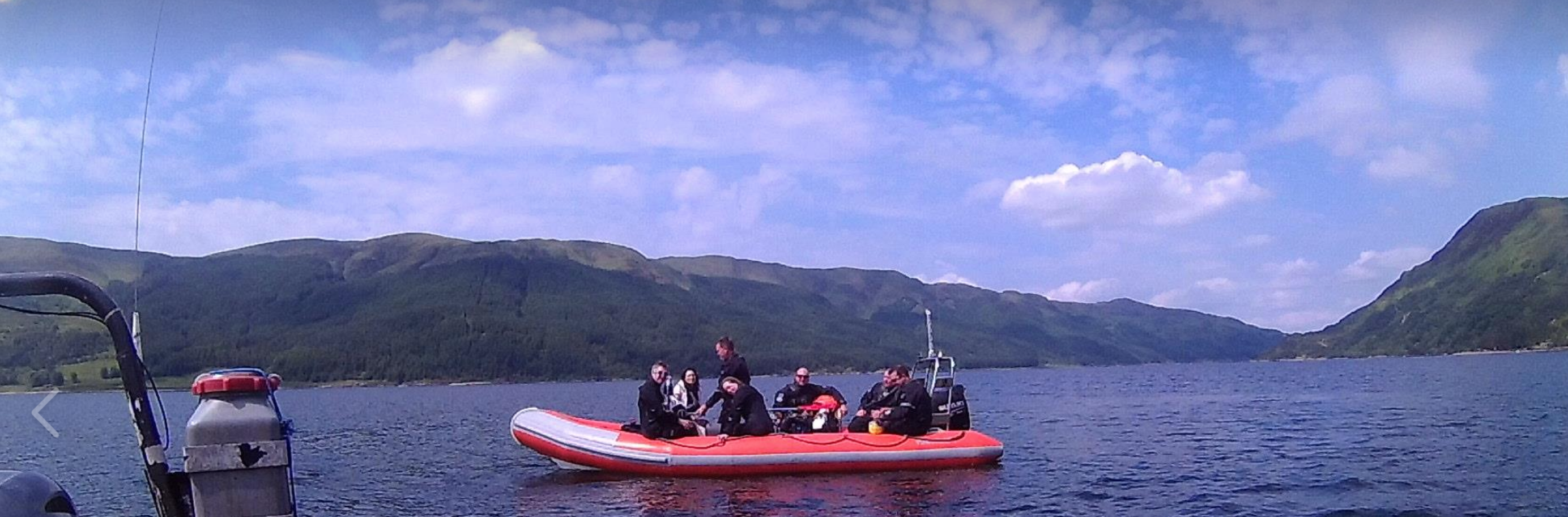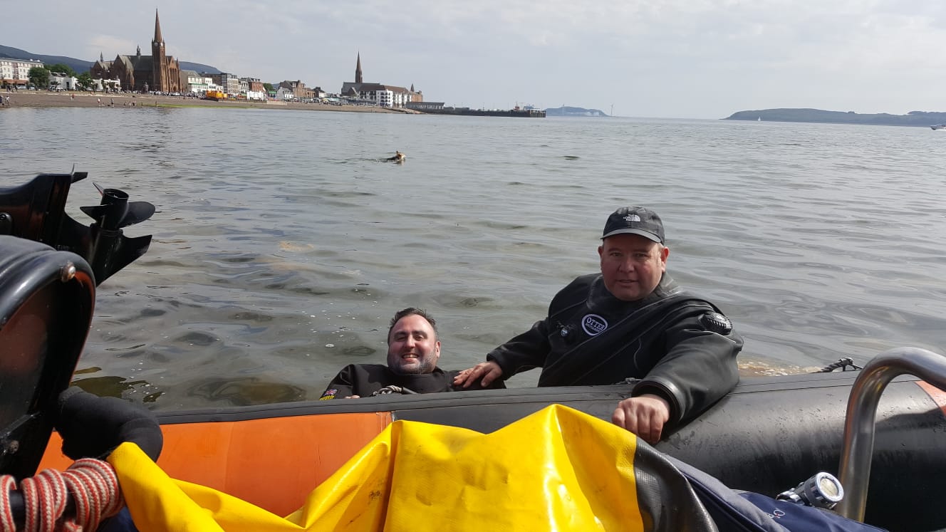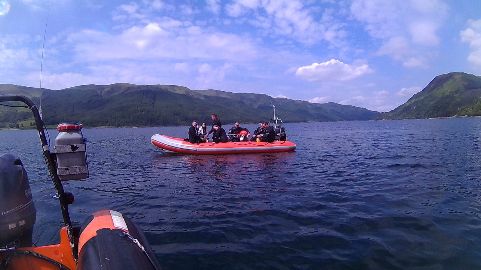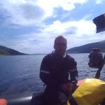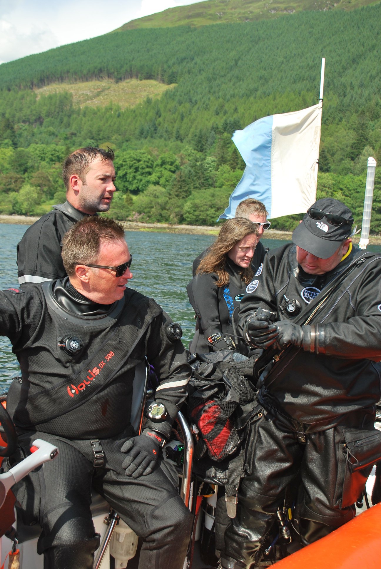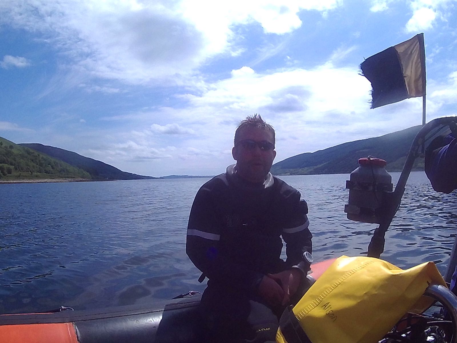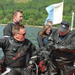 Some porpoises came along to wish us luck! Now came an exercise in buddy building. After team Top Cat dropped the shot it was up to Kev and Steve Welton to descend into the depths of the Loch to locate and then set a distance line up from the shot too the side charge. We attempted to shot near to – but not on top of the Side-Charge as we have never been assured that it was not actually “Live”!