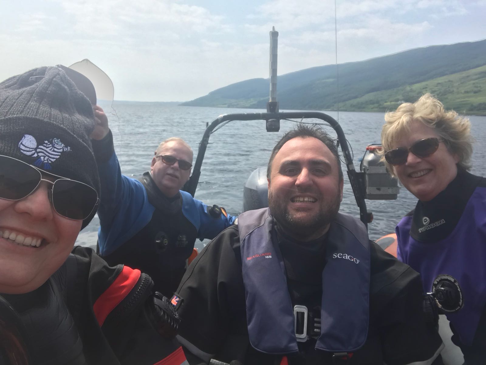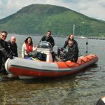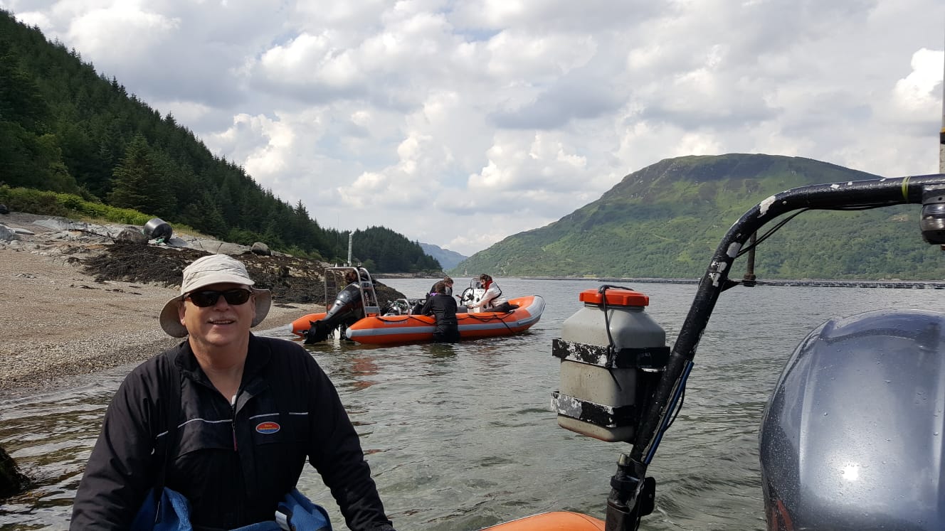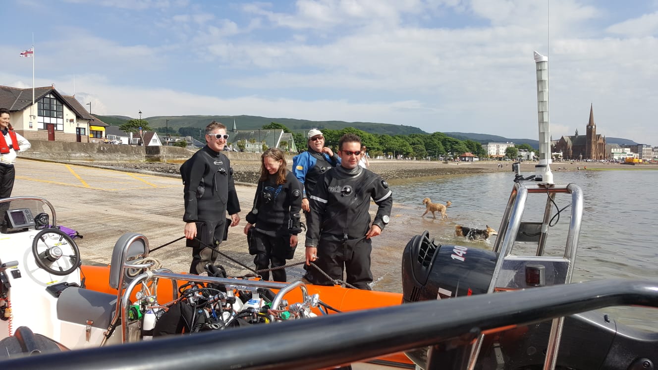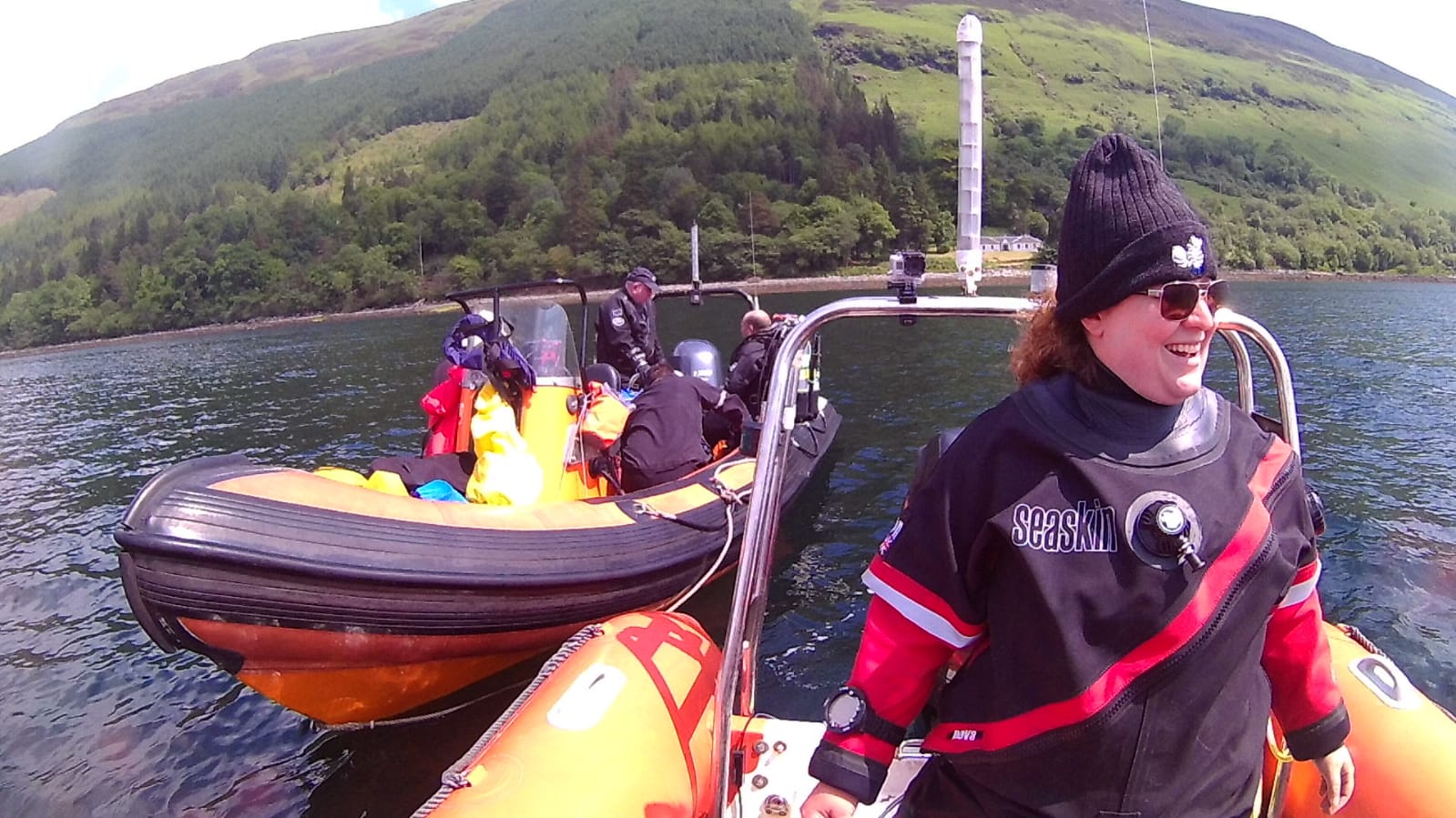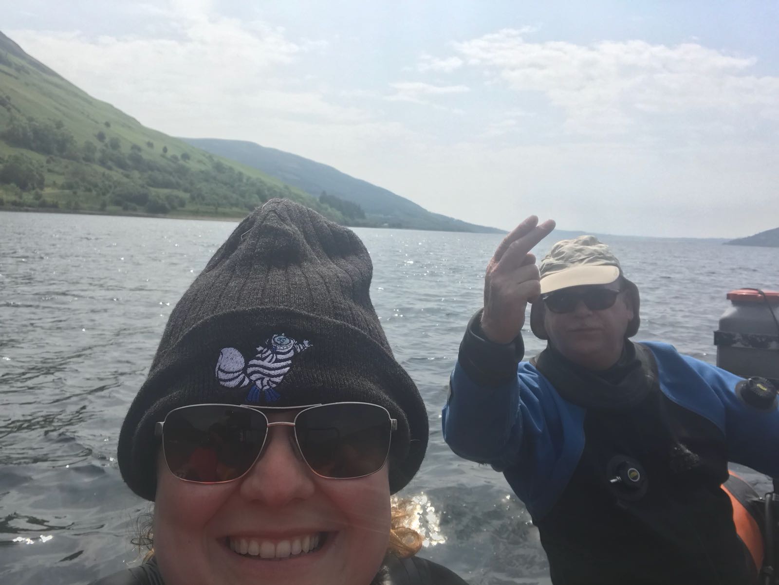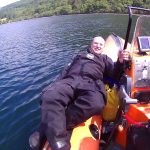 Some porpoises came along to wish us luck! Now came an exercise in buddy building. After team Top Cat dropped the shot it was up to Kev and Steve Welton to descend into the depths of the Loch to locate and then set a distance line up from the shot too the side charge. We attempted to shot near to – but not on top of the Side-Charge as we have never been assured that it was not actually “Live”!