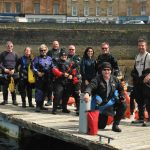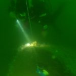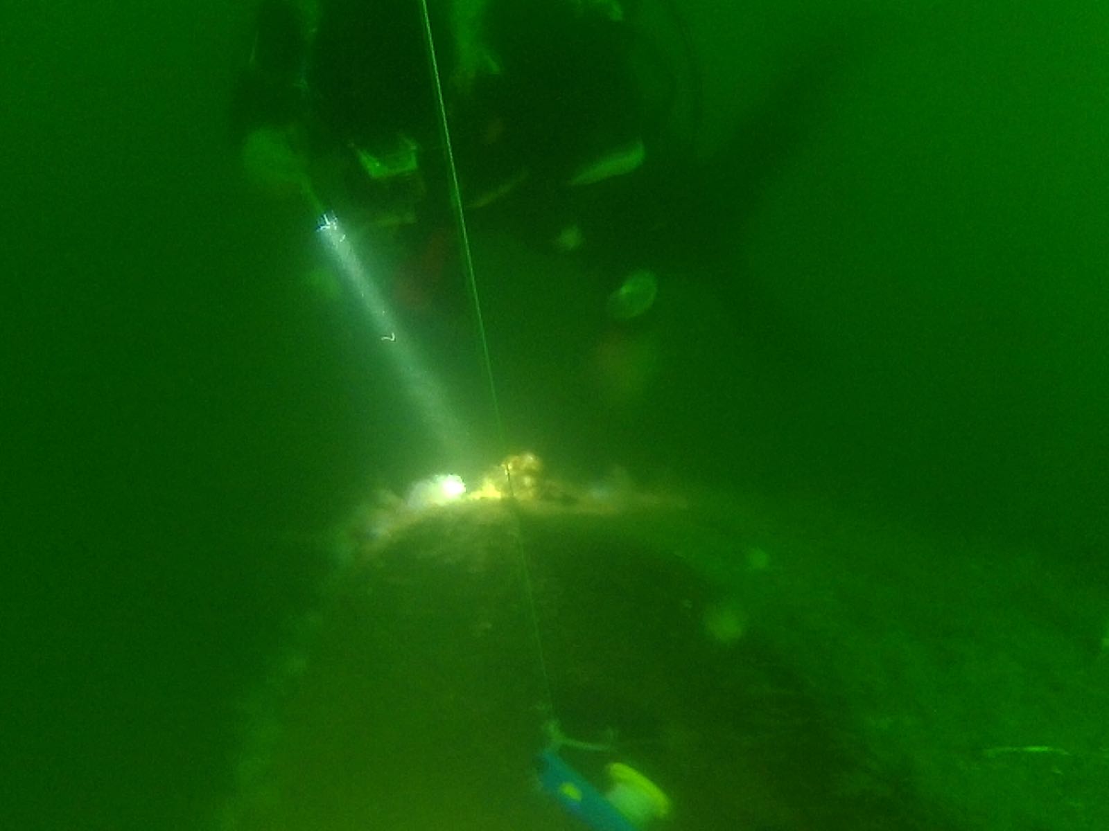 A few minutes passed and we thought the dark depths had got to Steve and Kev as their bubbles kept going round and round in circles. It wasn’t until they surfaced that we realised the visibility was so poor they had to set up a circular search pattern to locate the side charge. But it was a success and lines were now in so everyone could easily locate the start of the dive trail.
