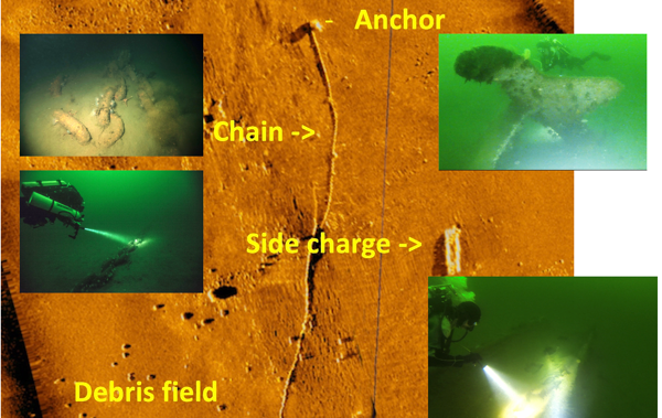 Dave Moss and Jon Green were up next. Tasked with running a distance line from the side charge to the anchor chain. Well not only did they manage to find the anchor chain, they even managed to run a line around two bombs and then sent a blob up for easy location. But there’s more, they then managed to travel the length of the chain north to the huge anchor and sent another blob up.. It only took 18 minutes of deco for Jon to come back up and Dave’s rebreather hadn’t failed him…yet. But this meant that we finally had a full dive trail!