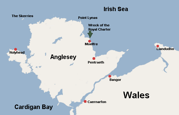 Off Point Lynas the Royal Charter tried to pick up the Liverpool pilot, but the wind had now risen to Storm force 10 on the Beaufort scale and the rapidly rising sea made this impossible. During the night of 25/26 October the wind rose to Hurricane force 12 on the Beaufort Scale in what became known as the “Royal Charter gale”. As the wind rose its direction changed from E to NE and then NNE, driving the ship towards the north-east coast of Anglesey. At 11 pm she anchored, but at 1.30 am on the 26th the port anchor chain snapped, followed by the starboard chain an hour later. Despite cutting the masts to reduce the drag of the wind, Royal Charter was driven inshore, with the steam engines unable to make headway against the gale. The ship initially grounded on a sandbank, but in the early morning of the 26th the rising tide drove her on to the rocks at a point just north of Moelfre at Porth Alerth on the north coast of Anglesey. Battered against the rocks by huge waves whipped up by winds of over 100 mph, she quickly broke up.