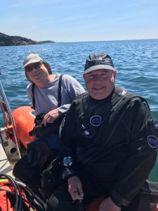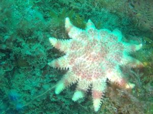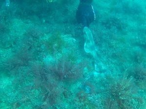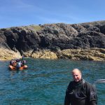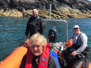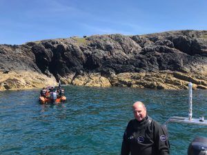 We dropped divers in close to the cliff face and again good viz 3 to 6m with a slight current, so turned into a gentle drift dive. Again loads of spider crabs and more dog fish than you could shake a stick at. We also discovered Dave Moss has a talent for charming Dog fish onto the palm of his gloved hand. We don’t have a photo but Nick B observed mossy in action. Once all divers were recovered we headed back to Treardurr for recovery of the boats.
