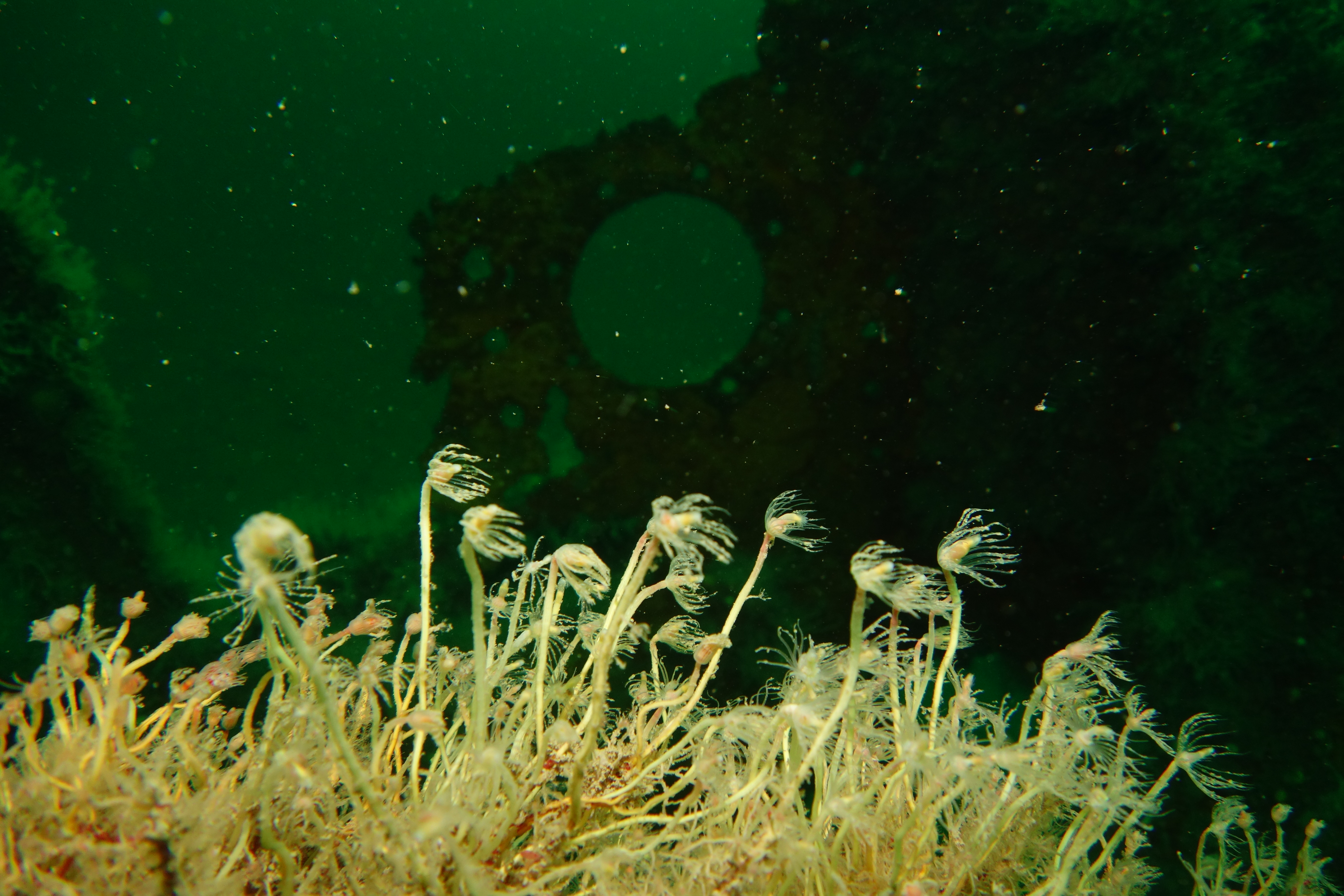 On Sunday morning despite a 2metre swell and strong westerly winds we headed over to Rathlin to dive the classic WW2 wreck, The Lochgarry. With 10m+ viz, slack water timed to perfection and an intact wreck with a tiled floor still in place, its structure covered in Oaten Pipe, Devonshire cup coral, elegant and cluster anemones, this was a superb dive. Large Pollack and Ballan wrasse drifted in and out of view and large shoals of fish inhabited the holds A massive chain keeps the lid on the hold containing munitions As the wind increased in the afternoon we headed back to the shelter of Ballycastle Bay to dive The Templemore. Large Conger eels with accompanying prawns and small edible crabs inhabited the pipes and boilers.